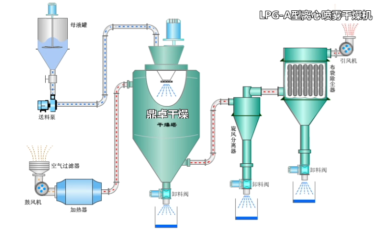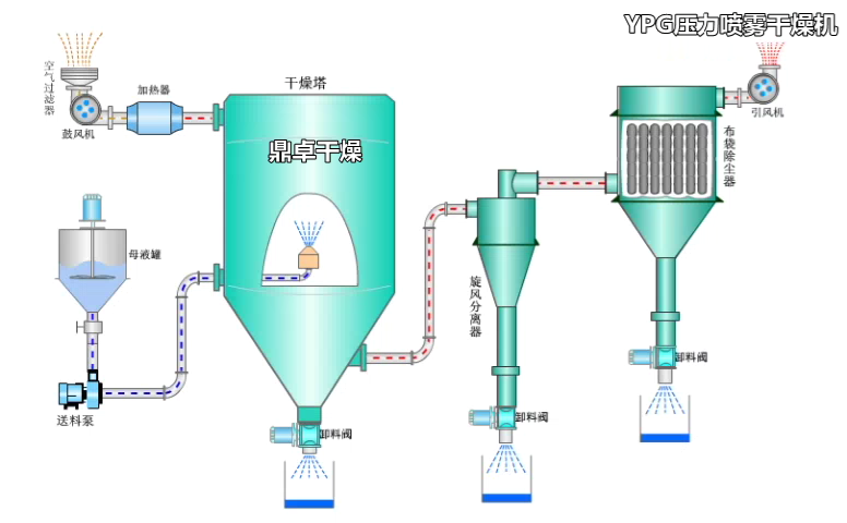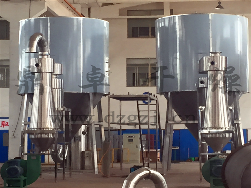 空氣經(jīng)過濾和加熱,進(jìn)入干燥器頂部空氣分配器,熱空氣呈螺旋狀均勻地進(jìn)入干燥室。料液經(jīng)塔體頂部的高速離心霧化器,(旋轉(zhuǎn))噴霧成極細(xì)微的霧狀液珠,與熱空氣并流接觸在極短的時間內(nèi)可干燥為成品。成品連續(xù)地由干燥塔底部和旋風(fēng)分離器中輸出,廢氣由風(fēng)機排空。