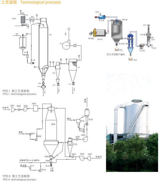 YPG系列壓力式噴霧(冷卻)干燥機(jī)是采用壓力式霧化器借助隔膜泵的壓力將溶液或漿狀的物料霧化成細(xì)微液滴,使表面積顯著增大,經(jīng)與熱風(fēng)進(jìn)行充分熱交換得以快速干燥(十幾秒至幾十秒),從而得到粉體或細(xì)小顆粒產(chǎn)品的設(shè)備。
