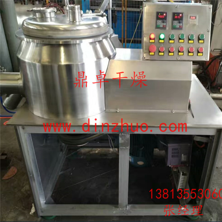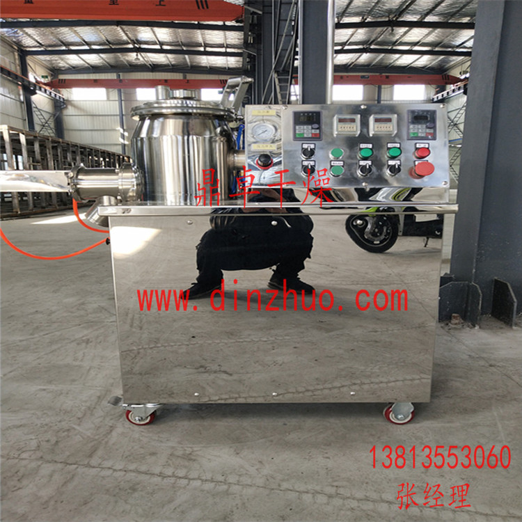 粉粒物料與粘合劑在圓筒形容器中由底部混合槳充分混合成濕潤軟材,然后由側(cè)置的高速粉碎槳切割成均勻的濕顆粒。設備密封由壓縮空氣驅(qū)動氣缸,保證了物料在混合時不會出現(xiàn)跑料的現(xiàn)象。當制粒完成后,打開側(cè)方出料氣缸,打開低速混合開關,小顆粒在離心力的作用下依次排出筒體。整個過程操作簡單,出料迅速。