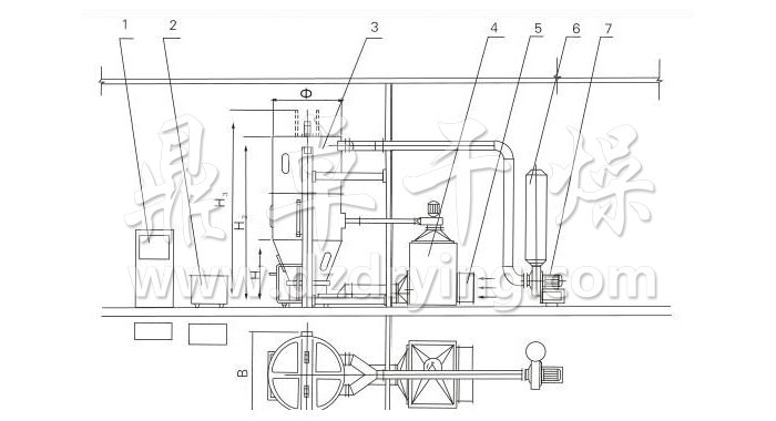 本機組工作過程為料液通過隔膜泵高壓輸入,噴出霧狀液滴,然后同熱空氣并流下降,大部分粉粒由塔底排料口收集,廢氣及其微小粉末經(jīng)旋風(fēng)分離器分離,廢氣由抽風(fēng)機排出,粉末由設(shè)在旋風(fēng)分離器下端的授粉筒收集,風(fēng)機出口還可裝備二級除塵裝置,回收率在96-98%以上。